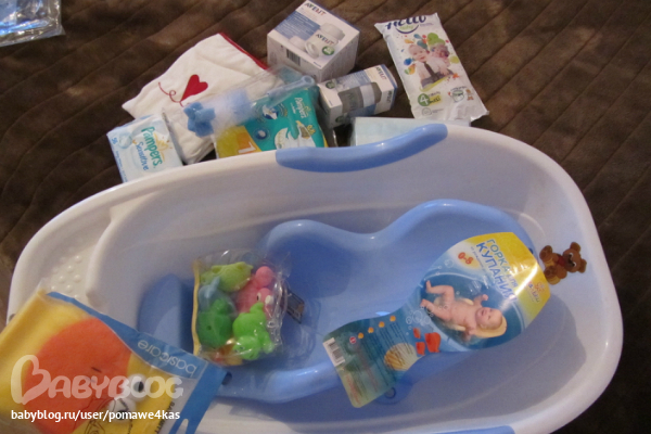 Еще одна подборка мелочей. Купательные игрушечки нам подарили. Чехольчик на пеленальный матрасик с сердечком. Какие-то подаренные подгузнички и т.д. И ванночка с мишкой =)