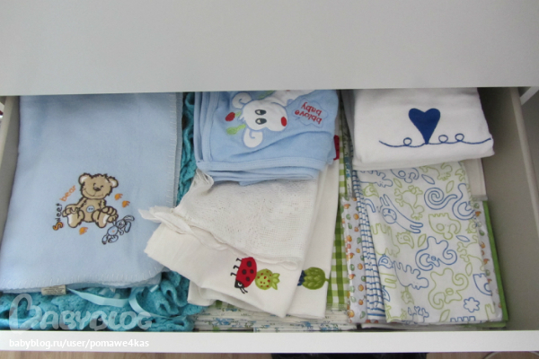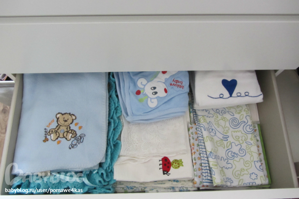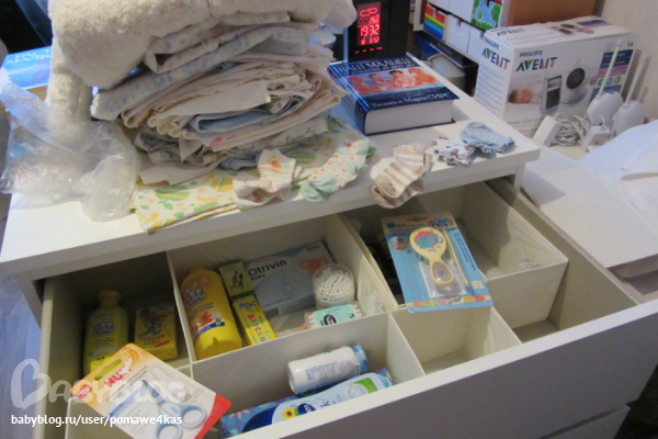 Многочисленные пеленки, которые еще ждут глажки. Всякие мелочи, носочки. А сбоку стоит пеленальник, на котором наша видеоняня и радионяня (вторую нам дали во временное пользование друзья, уже после того как мы купили видеоняню).