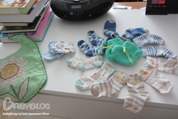 Носочки разных размеров (такие маленькие - ммммм...), царапки, мои пинеточки и подаренный хэнд мейд нагрудничек.