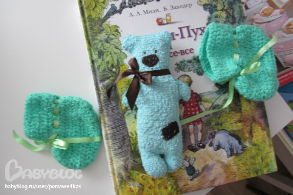 Связаные мной пинеточки и сшитый мной мишка-десночесалка из мохровой тканьки.