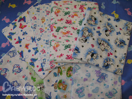 я сама шила, ткани самой разной накупила. Самй шить много полюсов- размеры какие хошь, можно сделать простынки, мягкие платочки, распашонки и чепчики из одинаковой ткани. Я даже пару наволочек сделала из остатков.