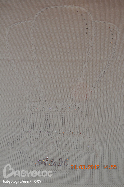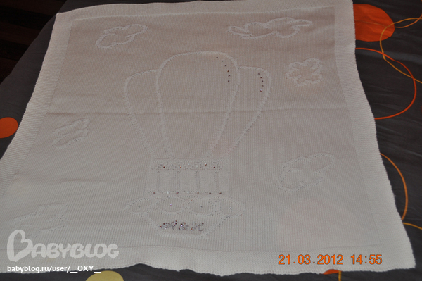 А это подруга моя подарок сделала. Очень красивый, вязаный пледик, можно на выписку использовать или просто укрывать в коляске, в люльке.