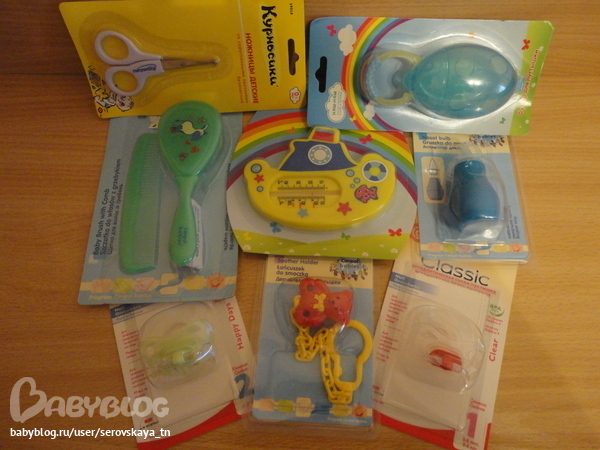 Малышку ножницы (кстати поразили цены в среднем 150-250 руб за них, взяла курносики за 80р., думаю они ничем не отличаются от дорогих), контейнер для пустышек, расчески, термометр для воды (понравился кораблик)), аспиратор для носика, ну и пустышки с цепочкой.