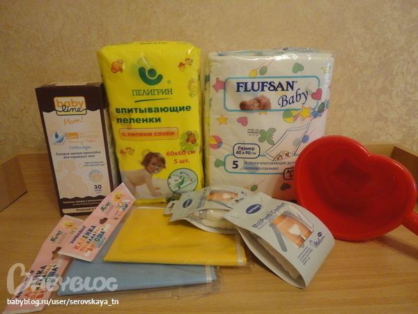 Решила взять 2 вида пеленок впитывающих : 1- обычные с детскими рисунками 60х90 ; 2- с липким слоем, чтоб не сбивались 60х60 (думаю все пригодяться). Взяла себе парочку трусов сеточкой, прокладки в бюстик гелевые Бэби Лайн, пару клеенок и ковшик понравился сердечком в ванну.))