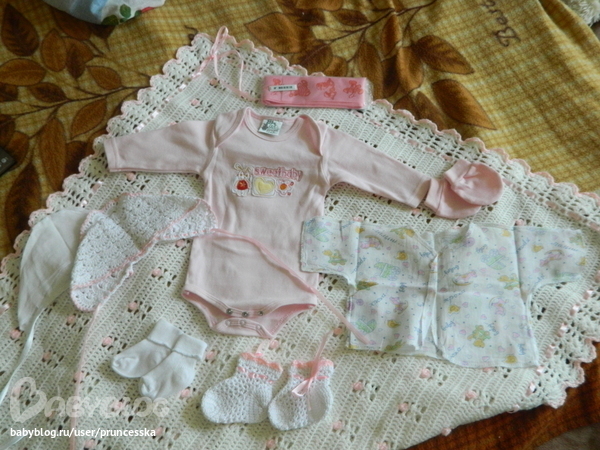 я вот тоже бодик с длинным рукавом приготовила,шапочку трикотажную,носочки тоже как шапка ,уголок с кружевом и тонкое синтепоновое одеялко,тоже сама шила и ленточку! в уголок один не завершень.она у вас там примет позу эмриона,он очень тонкий этот уголок...одеялко хоть как-то придерждивать будет малышку,потом сядете в машину,можно будет раскутать ее до уголка-пеленки или до бодика,смотря какая будет погода