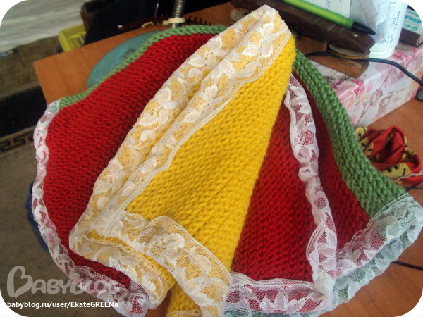 Тлько мне кажется, кантик из легчайшей ткани не совсем гормонирует с вязкой. Наверное пушистые бахрамушки из той же шерсти были б веселее -)))
