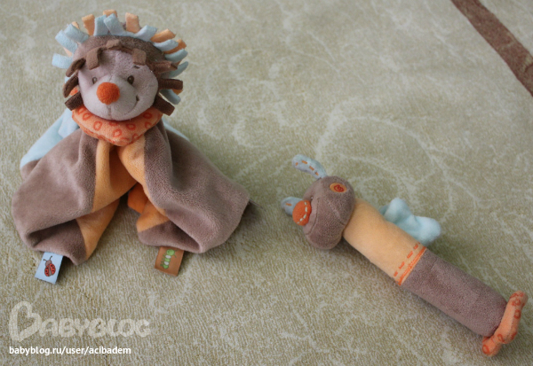 А игрушки одна длинненькая погремушка а вторая не помню как называется её мама на себе носит на груди а потом малышу в кроватку кладёт-она пахнет мамой и малыш спит спокойно-ну вроде как-то так.