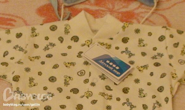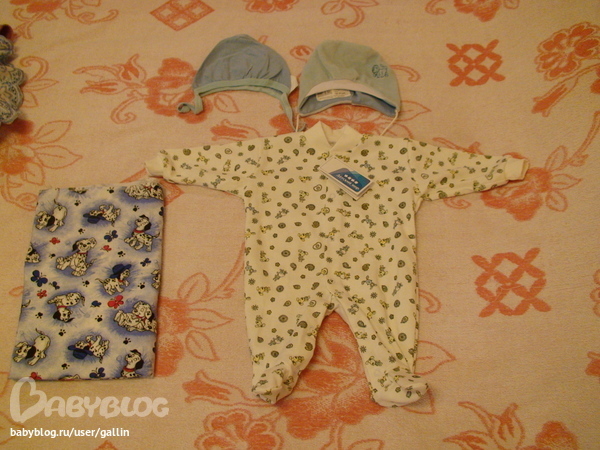 Это собственно слип с желто-зелено-голубым рисунком, наши шапочки - тонкая и тепленькая, еще вот свеженькая пеленочка, а-то егоркины все уже застиранные :))
