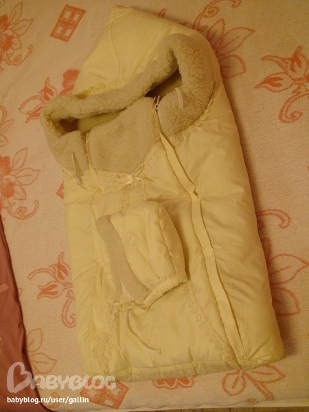 А это вот я достала егоркин конверт. Он на овчине. Даже шапочка сохранилась, но в ней мы очень недолго успели походить, а вот в конверте надеюсь еще и Сема походит месяцев до 3-4. Уж очень он удобный! (Давали родственникам поносить, вернули нам его грязным, так что ему еще предстоит чистка)