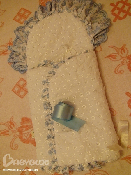 Конверт на выписку (достался нам от родственников). Ленточку купила :)) ГОЛУБУЮ!!!!! Конверт на синтепоне, довольно теплый на мой взгляд. на всякий случай приготовлю еще и байковое одеяльце внутрь - вдруг будет минусовая температура.