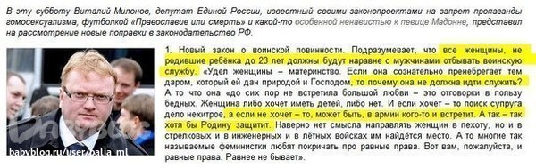 Бля, а мужики пусть арбузы через жопу себе засунут и носят 9 месяцев, если не отслужат в армии - кто там уклоняется или учится?.. Сравнение, конечно, грубое, но слов нет, больной дядя!!!