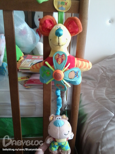Медвежонок на "оттягивалке", опускаешь его вниз (как сейчас на фото), начинает звучать колыбельная, у мышки крутиться очень-очень красивый пропеллер и мишка потихоньку поднимается вверх. Когда заказывала, даже не знала, что там мелодия играет!!!!!!!!!! мишка вообще потрясный-такой у него ми-ми-мишный хвостик сзади)))))))))))))))
