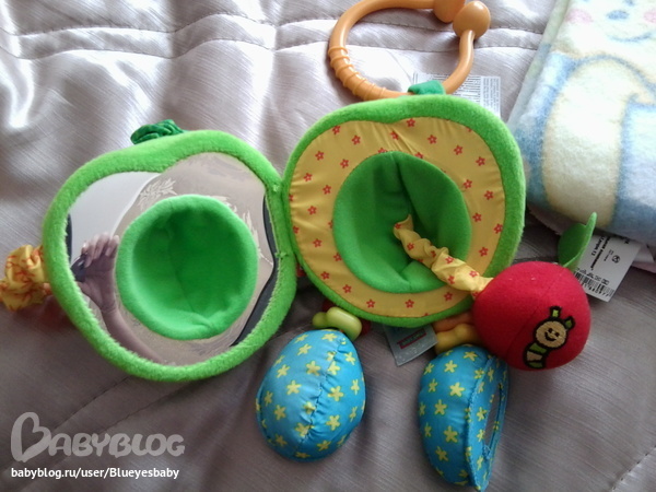 Это яблоко Энди меня саму вчера увлекало часа три, не могла им никак наиграться. чубчик оттягивается и шелестит, ручки-прорезыватели, тоже прикольно оттягиваются, в ножках погремушки, плюс колечки болтаются и на подошве зеркальца, а внутри....