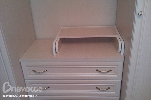 1)Начнем с комода) - к нему приложил руку мой муж. Я изначально хотела купить готовый пеленальный комод - но он меня отговорил. Мы весной заказывали новую мебель в спальню, и супруг клятвенно мне пообещал, что если мы возьмем комод от спального гарнитура - он сам к нему сделает пеленальный столик, чтобы потом, когда отпадет надобность в нем, просто открутить верхнюю часть, и все будет в едином стиле. На прошлой неделе он выполнил свое обещание
