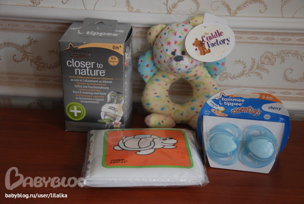 6. Бутылочка антиколиковая Tommee Tippee c ершиком, 2 пустышки (тоже Томи Типпи) на всякий случай, и 2 игрушечки - английская погремуха-медведик и книжечка для купания, которая в воде меняет цвет в зависимости от температуры.