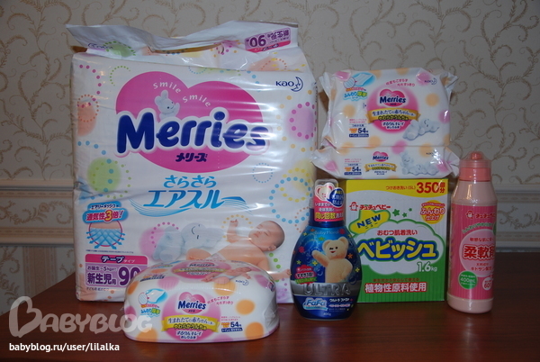Подгузники Merris до 5кг (newborn), пластиковый блок салфеток мягких влажных салфеток Merris до 3х месяцев и 2 сменных блока, жидкое мыло для стирки детской одежды Fa-Fa Nissan (синенькая бутылочка), стиральный порошок ChuChuBaby, и смягчающее средство-ополаскиватель ChuChuBaby (розовая бутылочка).