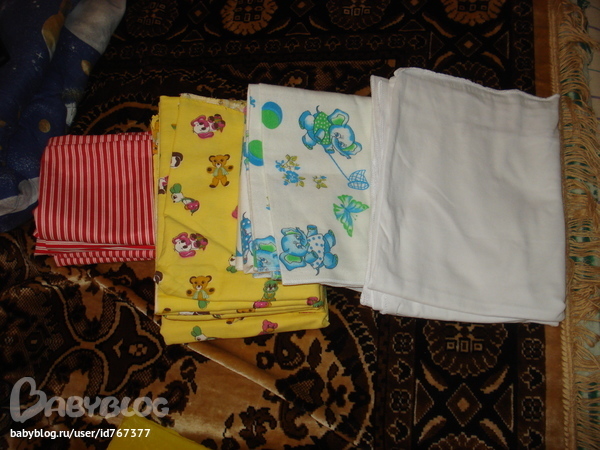 Пеленки - 10 пошила сама (дома нашла фланель и ситец), 2 из байки купила и 2 из трикотажа.