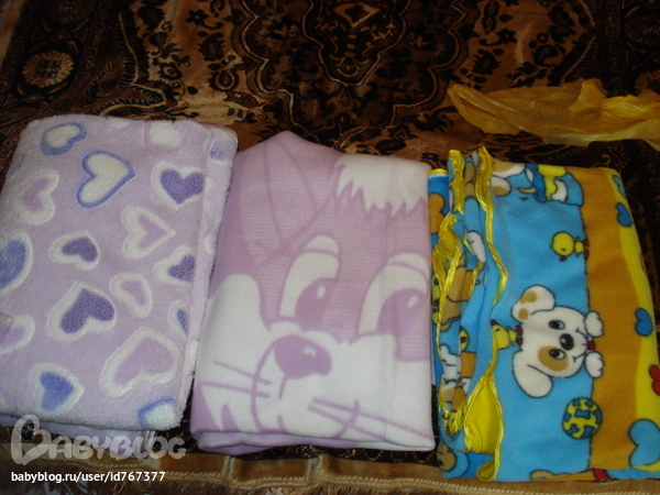 Пошила своему масику плед из офигенного материала (с сердечками), такой мягкий) и плед из флиса с собачками. А одеялко жаккардовое - купила, очень нежное, и хорошего размера.