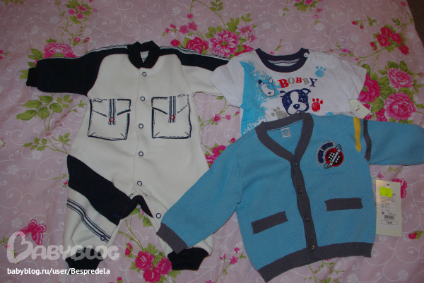 Очень мягкий и тепленький комбинезон Ёмаё с открытыми ножками 56 р-ра. Держу его про запас на выписку, ибо купила для сей цели классный Choupette (он будет чуть ниже), но 62 размера и он нам, крошкам, скорее всего будет очень велик, когда родимся. Справа футболочка и кофточка 68 размера: взяла в Глории Джинс, ну просто не смогла устоять перед мизерной ценой.
