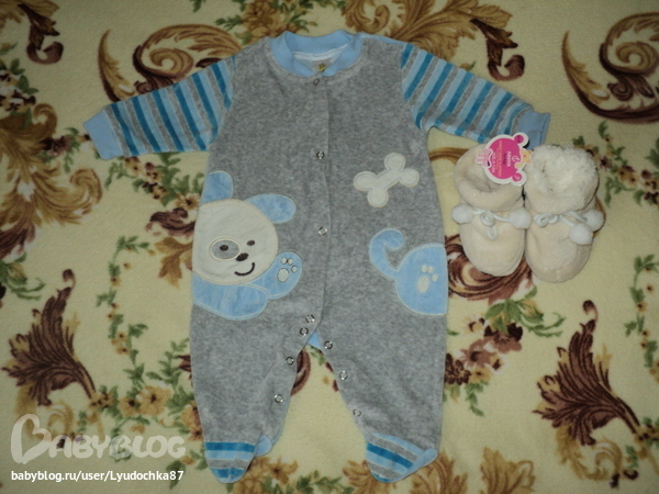 Это велюровый слип и пинетки... Незнаю будем носить пинетки или нет, у них единый размер от 0 до 12 мес., по мне так они немного большеваты(((