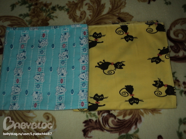 2 трикотажные пеленки, хоть и пеленок у нас гора и слышала отрицательные отзывы о трикотажных пеленках, все таки соблазнила меня цена, да и пеленка с кошками мне оч. понравилась)))