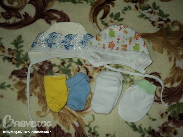 Пара новых чепчиков и носочки, ну и царапки))) Бежевый чепчик и голубые носочки купила нам бабушка, остальное я, так для дома)))