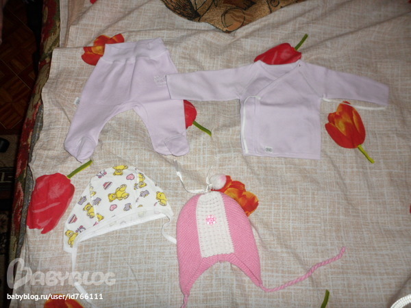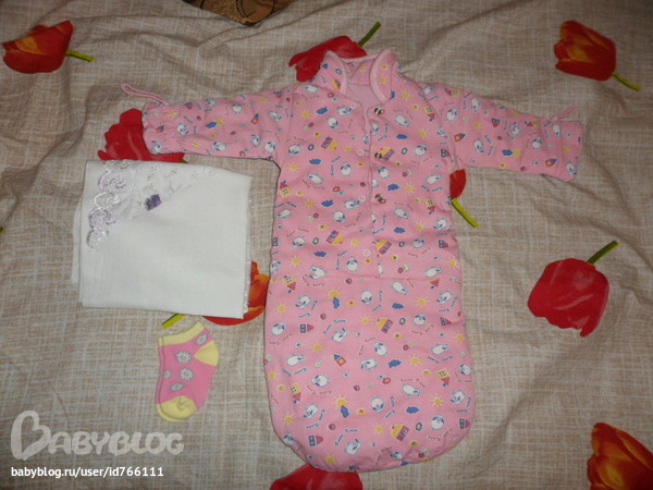 Расскажу о наших сборах, начну от нижнего к верхнему: распашонка тоненькая и фланелевая(я приверженец старых моделей, когда ситец одевался словно задом наперед - закрывая пузико целиком, а фланелька закрывала наоборот спинку и распахивалась на животике.), ползуны средней плотности. Затем одену сыночка в велюровый костюм. Потом комбинезон(аналогичный персиковому). И все таки решила завернуть сверху ляльку еще и в одеялко(стандартное от конверта) - сейчас выписывают на четвертый день, не надо пока крохе морозного воздуха хватать. Хотя у нас планируется до 15 мороза...но все равно не стоит. Рановато.