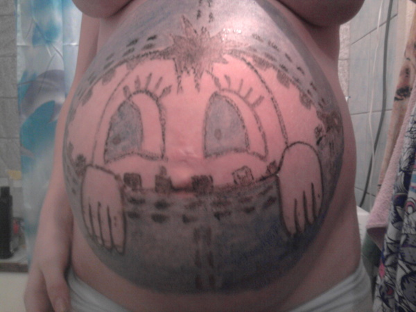 Фоты пузяшу дочки спала температура и муж с дочей решили порисовать на мне)стараааааааааались!ахахахахахахахаха.вот что получилось)ржали минут 30!грустный взгляд у малыша получился,да и сам страшненький вышел.но главное что было весело=)