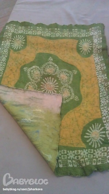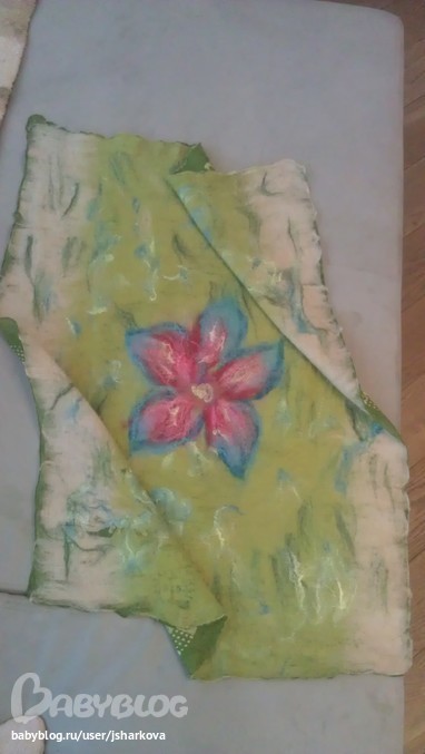 Приданое для малышаНа индийском шелке приваляла итальянскую шерсть, украсила цветком, получился летний лёгкий плед для моей маси... не всё получилось как хотела, я только учусь... но с любовью и в цвет коляски! розово-голубой цветок символизирует загадку пола))))