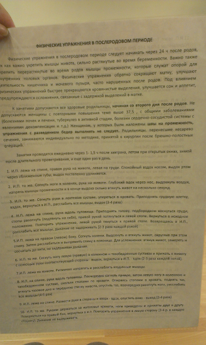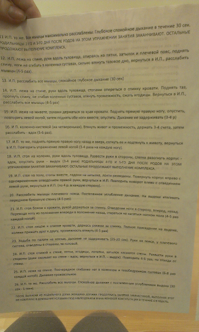 И так после родов, когда переведут в блок послеродовой можно, если есть силы делать упрожнения для востановления, но совсем легкие, без резкости и напряга.
