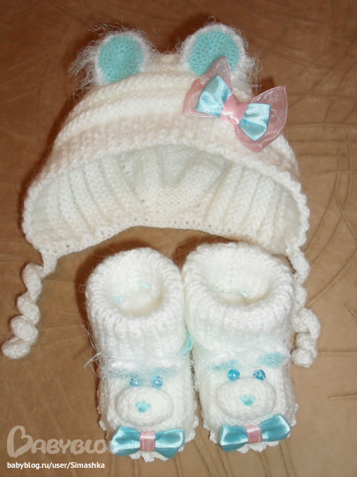 Это наш наборчик на выписку (шапочка голубая , потому что комбенизон уличный голубой - купили, когда еще нам мальчишку обещали), зато бантик розовый))))):