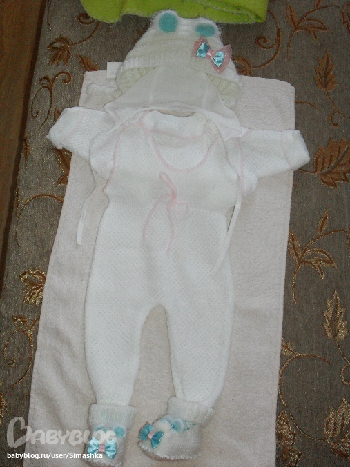 А с Шоупетовским шапочка и пинетки вообще не смотрятся...А их очень хочется надеть, я в общем-то их как раз на выписку заказывала, они миленькие такие тоже...И девочка из Кирова вязала, старалась...Жалко было бы не одеть очень))))