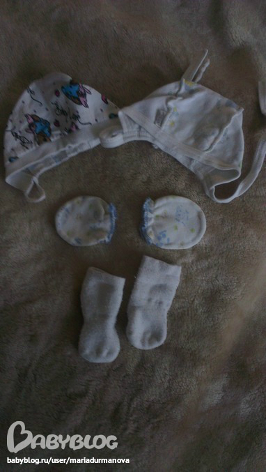 Второй вариант: конверт, уголок, боди, царапки, носочки, чепчик, костюм, шапочка