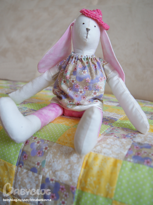 потом уже сюда же сшилась первая куколка-тильдочка, пусть поживет в кроватке до нашего приезда или появления..