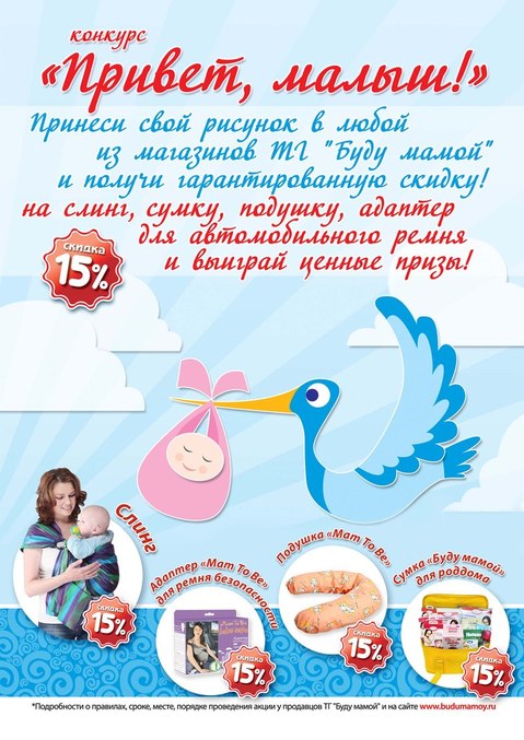 Будущие мамочки! Вновь запускает конкурс рисунков "Привет, Малыш!" Приносите свои рисунки в любой из наших магазинов, получайте скидку 15 % на подушку для кормления, сумку в роддом, адаптер для автомобильного ремня или слинг, а также шанс выиграть сертификат на 2000 руб.! Подробности тут -