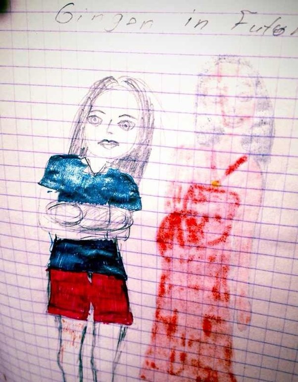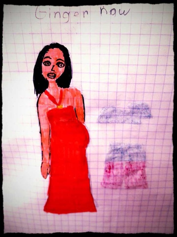 Обратите внимание, что на рисунке "Джинджер в будущем" мой цвет лица значительно изменился, а длинное алое платье сменилось на шорты с футболкой. Ну конечно, шоб малыш своими срыгиваниями сарафан то не попортил.