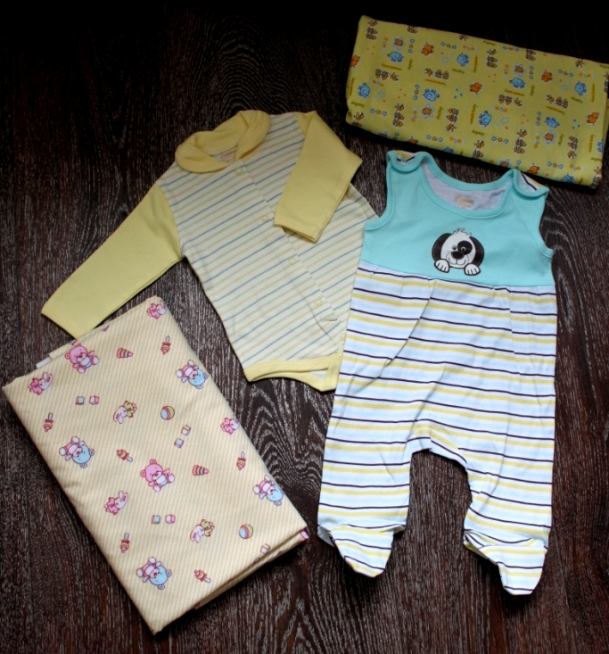 Мама пеленочку сшила, на выписку. Вниз бодик , подгузник (купила гун) пододенем,шапчулю тоненькую и носочки.