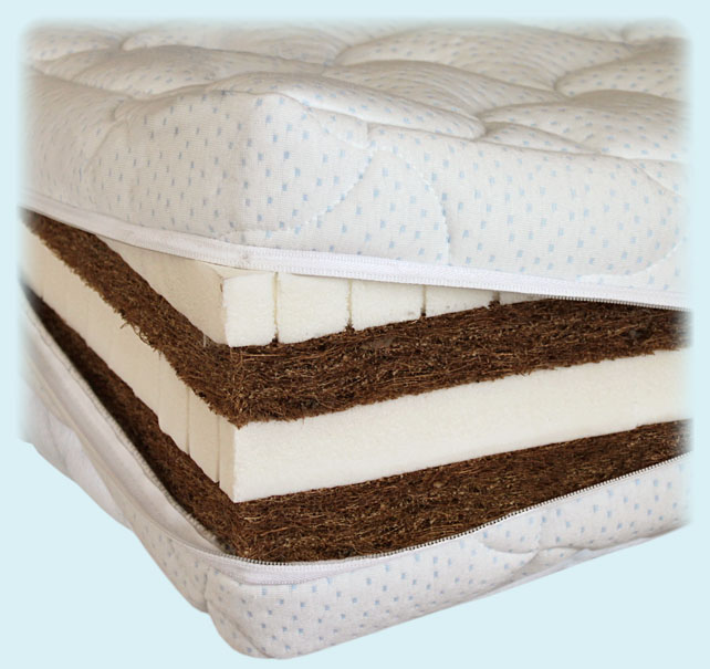 Кокосовый мат производится из очёса кокосового волокна и латекса - экологически чистый, гипоаллергенный, нетоксичный материал. Не является средой обитания клещей, обладает самой низкой остаточной деформацией.
