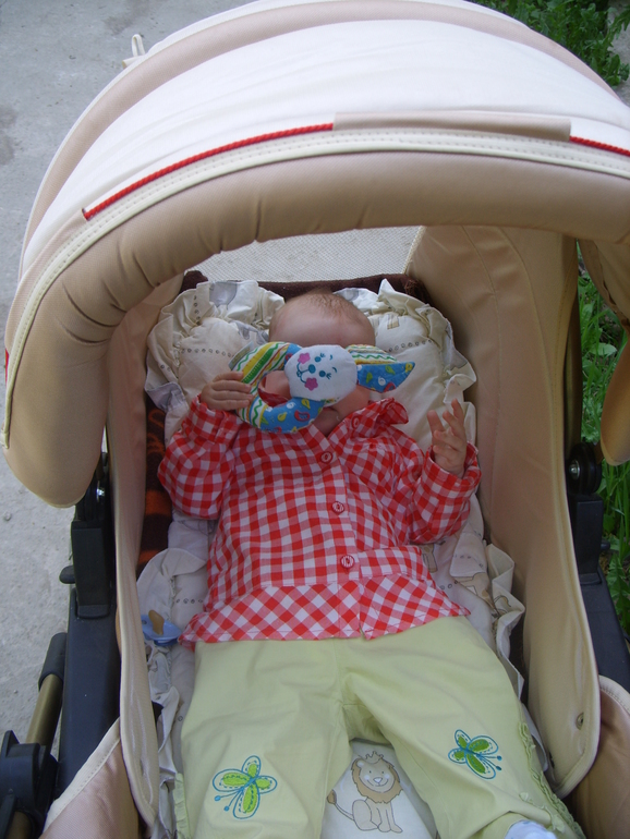 Это наша коляска. А летом сзади капюшона открыли окошко, а подросшая, но еще не сидящая детка, с удовольствием разглядывала улицу.