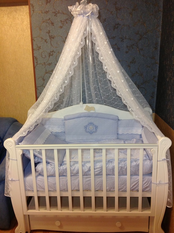 У меня такой ажурный, молочного цвета, с вышитой короной. А у Вас?)Руки чешутся уже все поставить в кроватку, но, боюсь, запылятся за месяц!