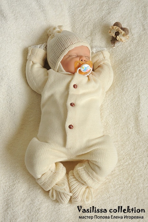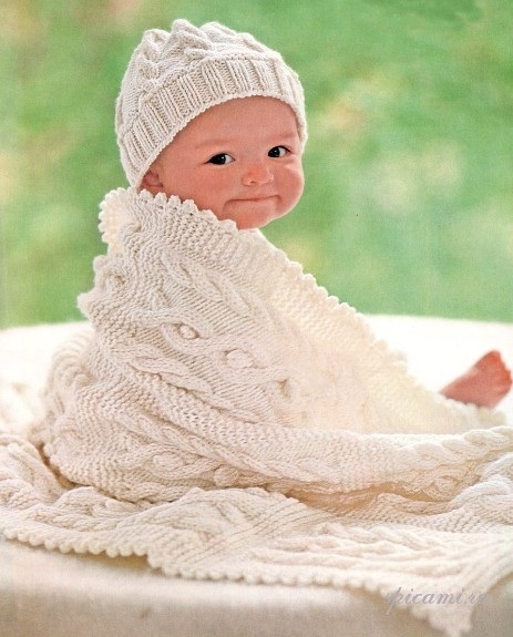 Мы, вдохновившись выпиской принца летом, сразу решили, что эта история про нас и, несмотря на выписку в октябре, обязательно будем в вязаном пледе как принцессы. Поэтому нам на заказ связали белоснежный, нежнейший плед-одеяло, теплый конечно, а под него все в одном стиле: кофточка, штанишки, шапочка, пинетки, под это все понятно, что х/б слипы и тонкая шапочка и носочки. Пока не успела забрать, поэтому без фото, но что-то типа этого, думаю до машины не замерзнет. Думаю, будет шикарно и на фото очень красиво. Только не рюши и дикие банты на не менее диких конвертах ( есть и прекрасные конверты, я же говорю прям вот о полной советской бесвкусице).