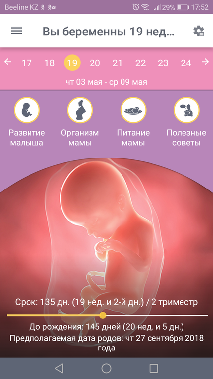 Так выглядит главная страничка. Нравится, что написано количество прошедших и оставшихся неделек беременности.