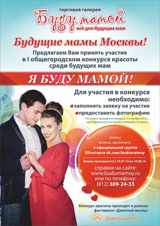 О хорошемБудущие мамы Москвы! Вы активны? Чувствуете в себе творческий потенциал? Уверены, что «интересное положение» - прекрасный повод проявить себя? Тогда спешите присоединиться к участницам Первого Общегородского конкурса красоты для беременных "Я БУДУ МАМОЙ" Москва 2014!