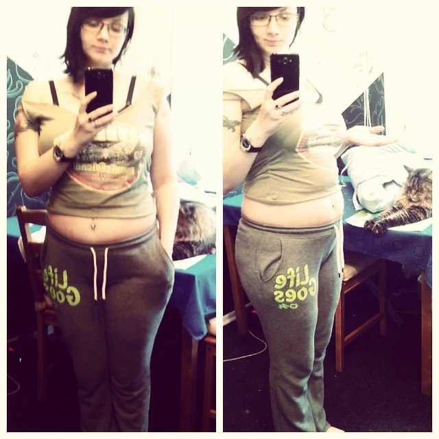 Ну кыскан у вас деловой!Сразу видно хозяин)))Радуйтесь,что животик небольшой,с большим ооочень неудобно,не знаешь как лечь и тем более встать с кровати...