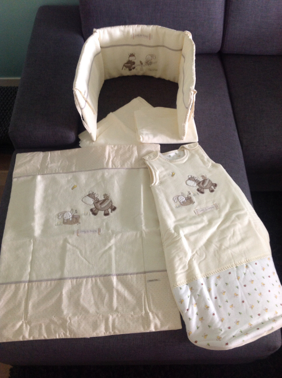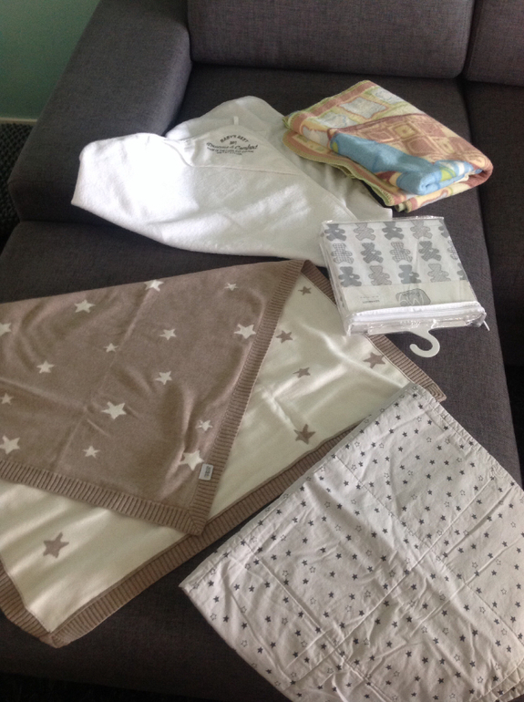 Дальше пледик, покрывало-подстилка, полотенце-уголок, байковое одеялко и постельное белье, еще не определилась как доче спать- толи под одеялом, толи в мешке. На всякий случай купила и то и другое. И все для кроватки: бортики, спальный мешок, покрывалко и две простыни. Все от Mamas and Papas, одной серии. Когда соберем кроватку, все заправлю и еще сфоткаю. Мне кажется, должно быть красиво и тепло.