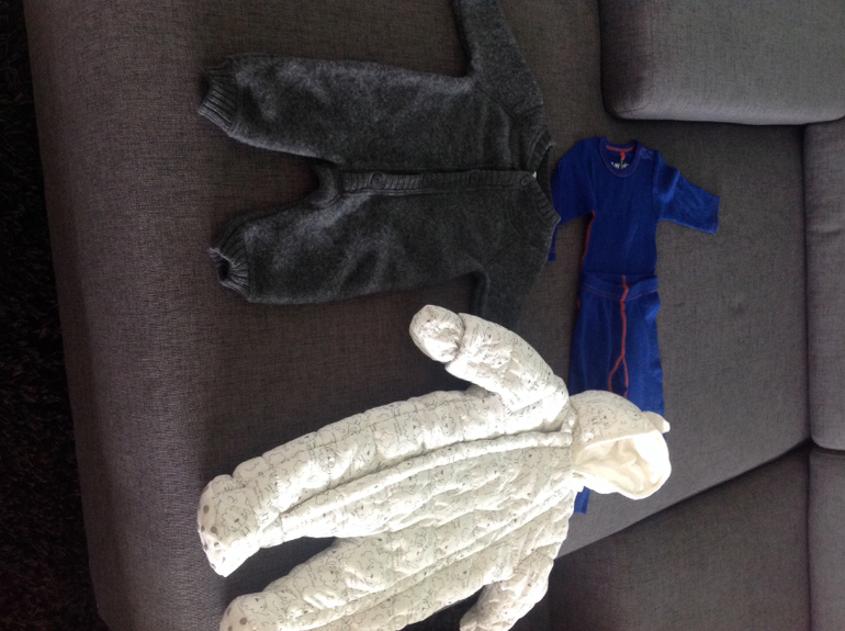 А здесь тепленькое. Термобелье шерстяное мягкое (покупалось еще на мальчика), комбезик чистая шерсть, очень мягкий, как пуховый. Оба покупались в Норвегии, они специалисты по утеплению и шерсти. И просто комбез с мишками и капюшоном, купили в Mothercare. :