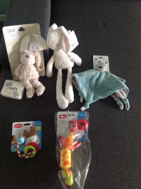 Первые игрушки. Мишка вешается на стенку кроватки на первые месяцы вместо мобиля, нужно по тянуть за чемодан и будет играть колыбельная музычка. Зайка-первый друг, зайка на тряпочке просто для засунуть в рот и жамкать, ну и пара погремушек.