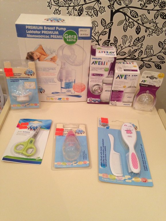 Молокоотсос, пара бутылочек, пара сосок, пустышка-термометр, ножнички, соплесосалка, щётка для волос. Долго думала о том, брать ли заранее молокоотсос и бутылочки. Но потом вспомнила, что в два дочкиных месяца у меня будет сессия (доучиваюсь на заочном), и ребёнок будет по несколько часов в день с мужем. Пришлось к этому начать готовиться.
