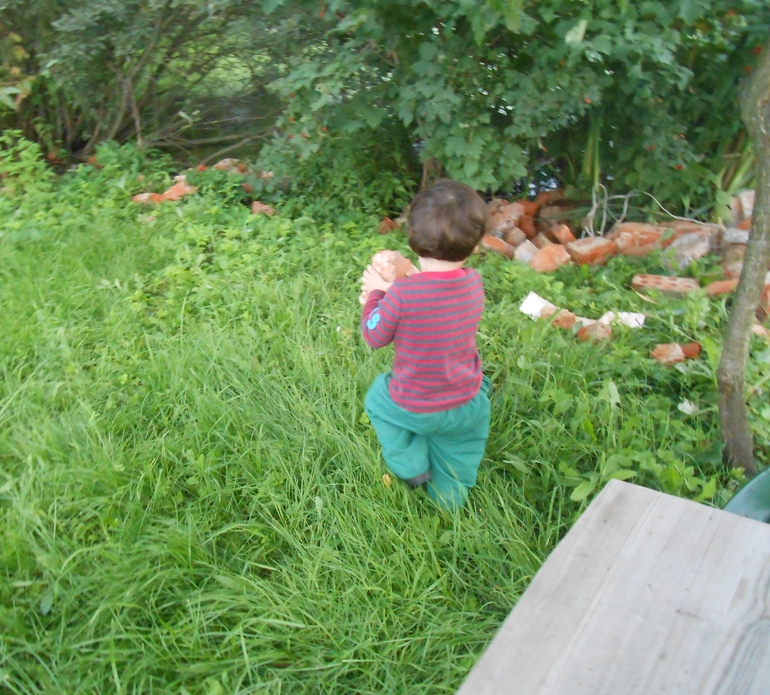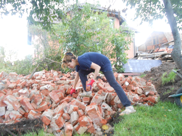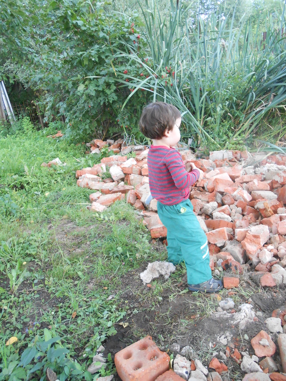 А еще началась планировка участка, чему поспособствовал сосед с нашей улицы. Он тоже начал строить дом и свез к нам часть кирпичного боя от старой постройки и несколько машин земли (больше глиняной правда), вырытой под цокольный этаж. Это нам здорово поможет поднять наш низкий участок, сделать небольшие уклоны от дома.