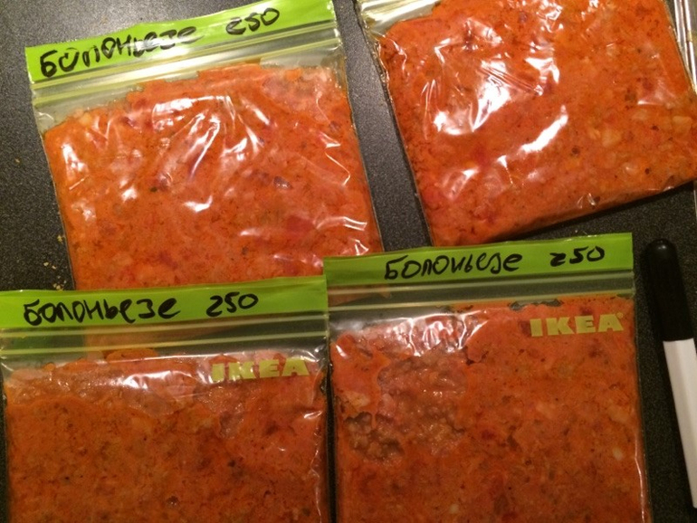 - рагу, соусы для пасты можно также разложить по пакетам/контейнерам для семейного обеда, на который не будет особо много времени